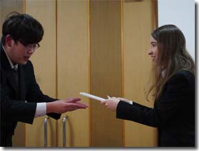 抽選会の番号を引く三枝議長 当選者(右)に賞品の授与!!