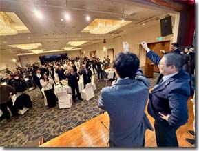 懇親会では、恒例の単組紹介、青年女性協によるお楽しみ抽選会を行い、会場は大いに盛り上がりを見せた。最後は牛山議長、武田議長の団結がんばろー三唱で絞めくくり、春闘勝利と政策制度実現に向けて取り組むことを誓い合った。