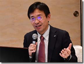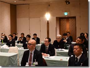 冒頭の挨拶を行なうM代表幹事 講演に熱心に耳を傾ける参加者